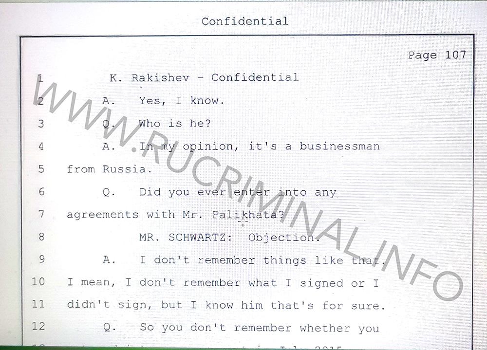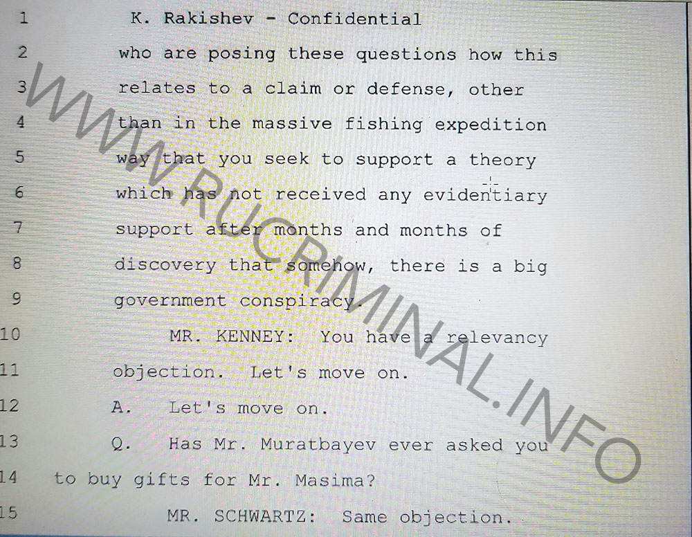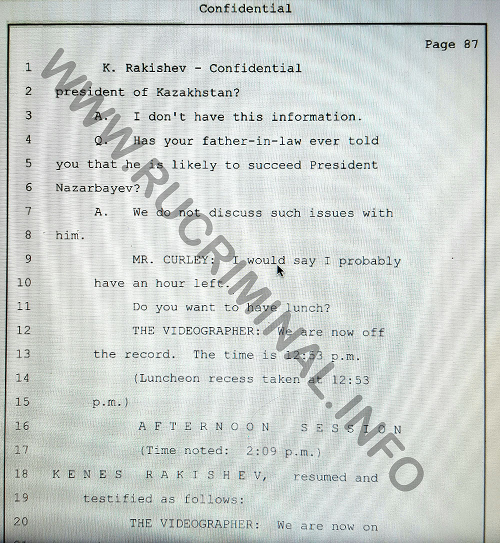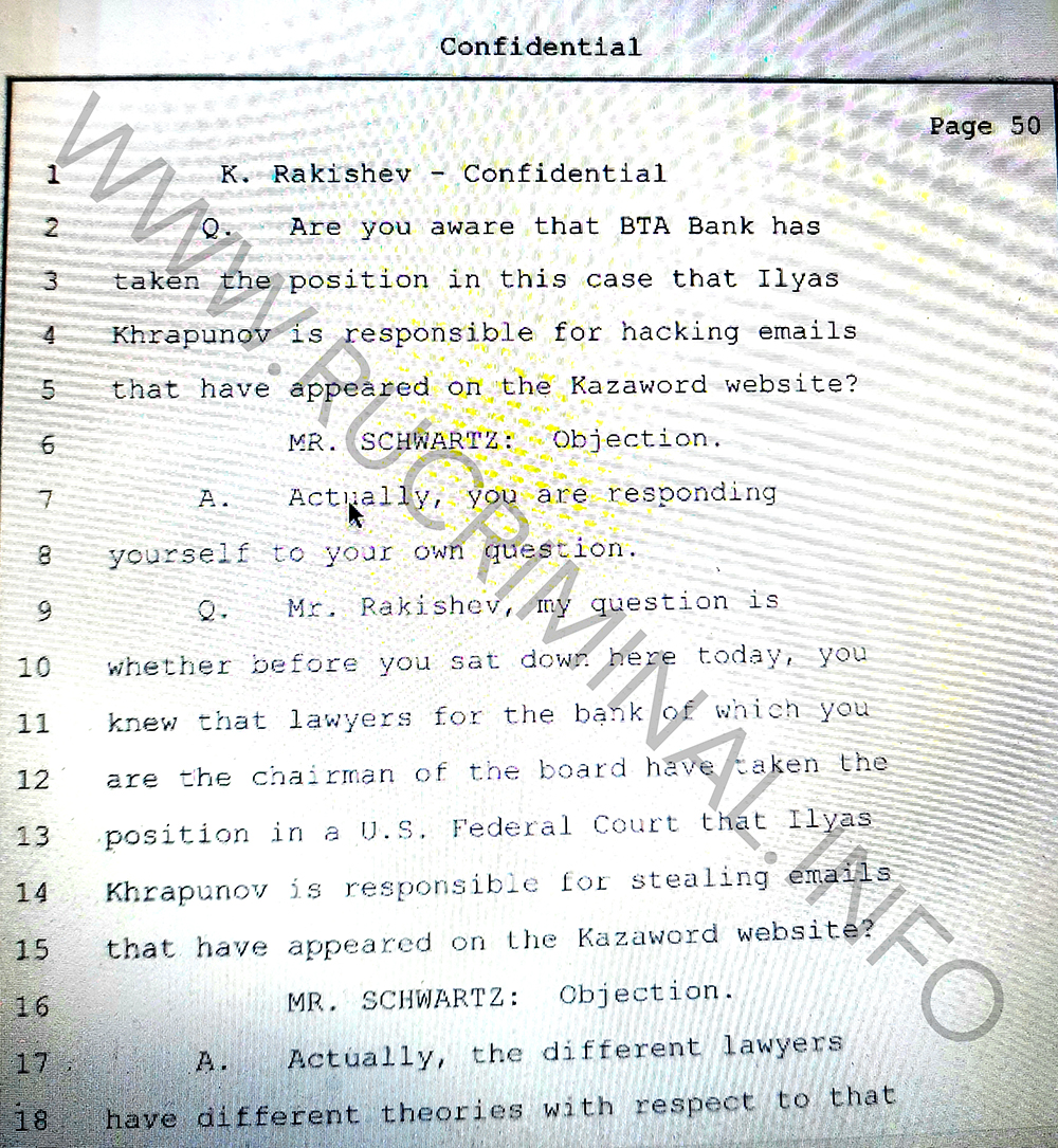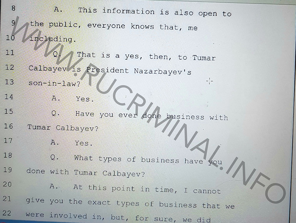 Рассказываем об американских показаниях казахского олигарха Кенеса Ракишева. Они были озвучены Ракишевым в суде США, где был рассмотрен иск БТА-банка к бывшему собственнику банка Мухтару Аблязову, экс-главе столицы Казахстана Виктору Храпунову и его сыну Ильясу Храпунову. Адвокаты последних, пытались доказать на процессе, что Ракишев только номинальный собственник БТА-банка. В реальности банк контролируется людьми из «верхушки» Казахстана и именно эти люди и стоят за преследованием Аблязова и Храпуновых. Имена этих персон из «верхушки», с которыми лично общается Ракишев, были озвучены. Сам Кенес факт тесного общения напрямую с ними или их представителями не отрицал. Это руководитель КНБ Карим Масимов, зять главы Казахстана Тимур Кулибаев и лично Нурсултан Назарбаев. Все эти имена есть в протоколах допроса Ракишева, заверенная копия которых оказалась в распоряжении rucriminal.info. На вопросы о конкретной деятельности БТА-банка, в котором Ракишев на момент допроса занимал должность председателя совета директоров, активах банка он отвечает одно- «Я не знаю». В ходе слушания выяснилось, что БТА имеет интересы в Конго и Судане. Также, Рукриминал закончил публиковать показания Кенеса Ракишева в американском суде, где был рассмотрен иск БТА-банка к бывшему собственнику банка Мухтару Аблязову, экс-главе столицы Казахстана Виктору Храпунову и его сыну Ильясу Храпунову. Поскольку Ракишев давал показания под присягой, можно не сомневаться, что в Рукриминал подготовил для читателей своеобразный дайджест наиболее важным моментов, озвученных Ракишевым. Впрочем, это не означает, что на этом мы закончим наше расследование о скандальном олигархе. В распоряжение редакции оказались документы о совсем юных годах Ракишева, в которых тоже немало занимательных сведений, в то числе о его автопарке тех времен. Когда мы закончим изучать эти сведения, они будут преданы на огласке. Пока же вернемся к показаниями в суде США.