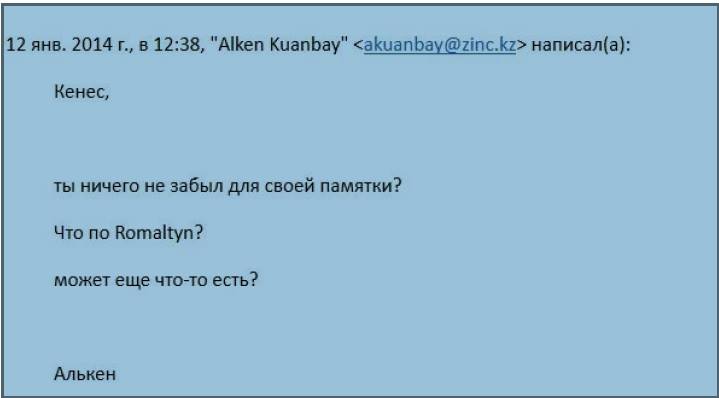 Она датирована 12 января 2014 года. 12 января 2014 года в 12:38 Alken Kuanbay написал: «Кенес, ты ничего не забыл для своей памятки? Что по Romaltyn?может еще чтото есть? Алькен». В 12.40 того же дня Kenes Rakishev ему ответил письмо с пометкой «активы»: «Ты красава! Давай сегодня еще сядем!» На что получил ответ: «Брат, высылаю обновленную памятку. Сегодня можно вечером… щас ко мне гости придут или завтра. Алькен».