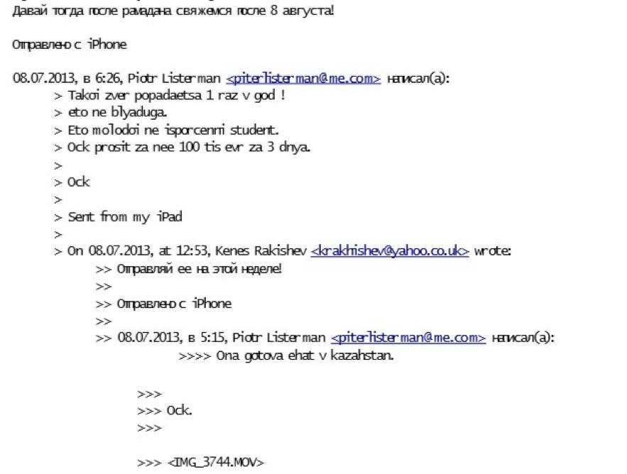 Происходит следующая переписка, заканчивающаяся письмом Ракишева: «Давай тогда после рамадана свяжемся после 8 августа!». Нужно отметить, что Кенес Ракишев, как мусульманин, предпочитает не грешить в священный месяц, в прессе даже появлялись снимки с его хаджа в Мекку. Ock (англ – Очкарик – автор) религиозности олигарха не разделяет, и пишет, что «такой зверь продается один раз в год». Ракишев уступает и просит отправить девушку в Казахстан «на этой неделе».