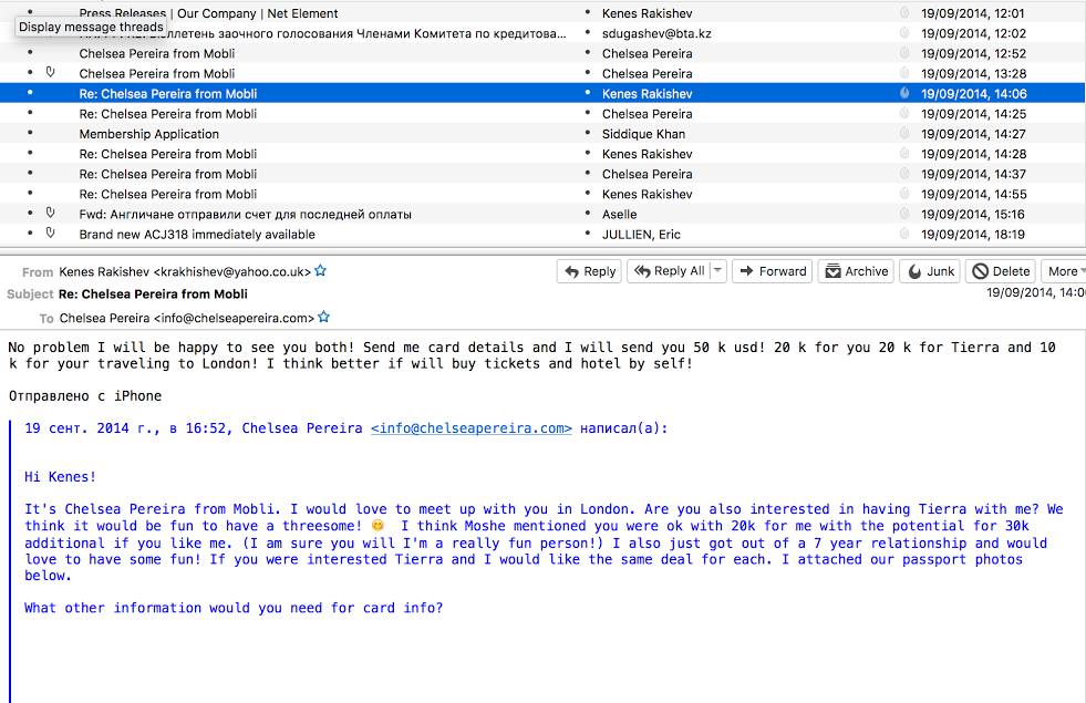 Надо отдать должное настоящему мужчине Ракишеву, который не растерялся и выразил готовность провести время сразу с двумя горячими девушками. «Не проблема, я буду видеть вас обеих! Пришлите мне данные карты, и я пошлю для вас пятьдесят тысяч долларов», — пишет казахский предприниматель.
