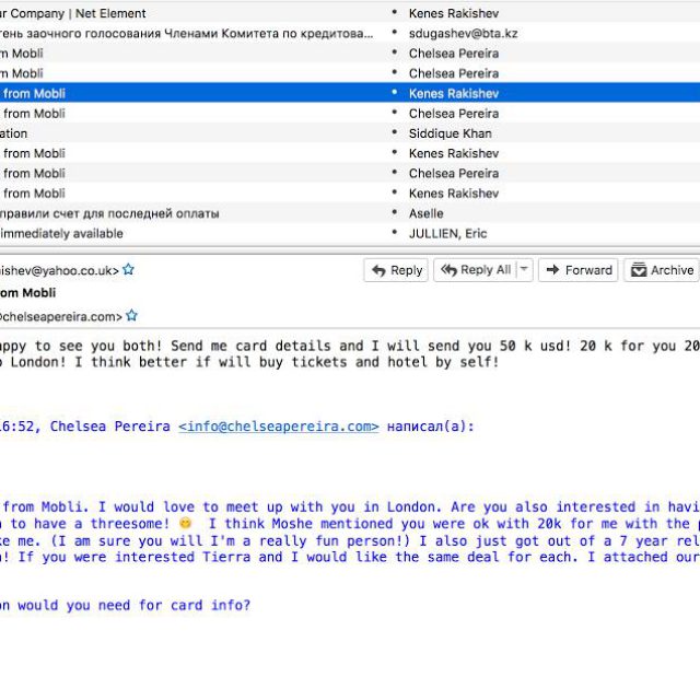 Судя по тому, что после уточнения технических вопросов, Челси Перейра высылают Кенесу Ракишеву данные забронированного отеля и дату перелета из Лос-Анжелеса в Лондон, октябрь 2014 года в жизни казахского олигарха выдался запоминающимся — в Лондоне ему не дали замерзнуть сразу две американские штучки, о которых грезят миллионы мужчин в мире.